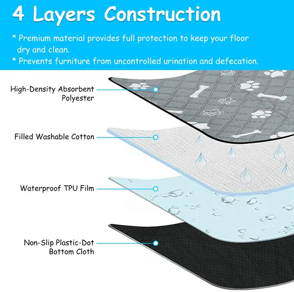 Great Absorption Performance: Constructed with high-density absorbent polyester, filled washable cotton, waterproof TPU film and plastic-dot bottom cloth, our 4-layer pet mats not only provide your dog soft and comfortable feelings, but also quickly absorb and hold the liquid all day long without any leakage.