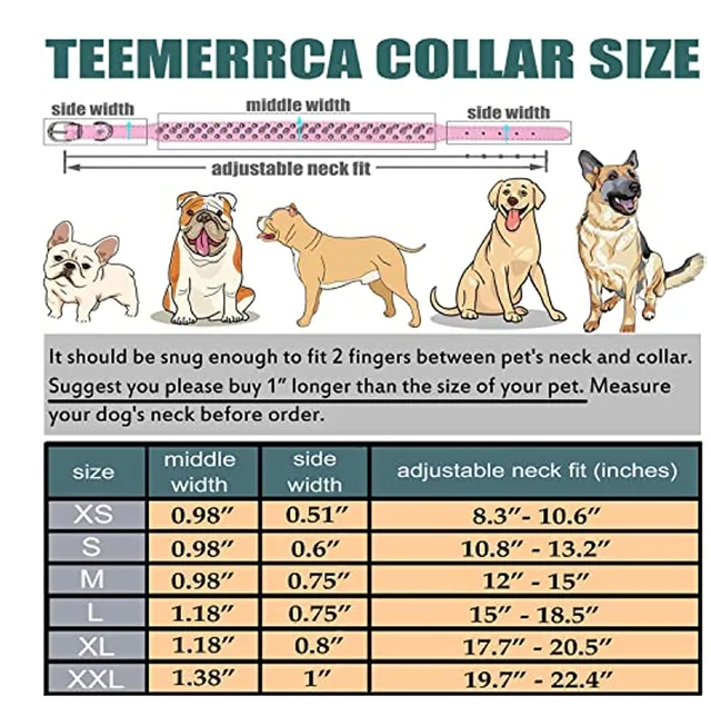 ADJUSTABLE COLLARS FOR DOGS XS: 8.3"-10.6"; S: 10.8"-13.2"; M: 12"- 15"; L: 15"-18.5"; XL: 17.7"-20.5"; XXL: 19.7"- 22.4". Suitable for puppies; small dogs; medium dogs and large dogs like Chihuahua; shih tzu; poodle; corgi; saluki; Jack Russell terrier; pug; Pit bull; husky; Shiba; Boston terrier; French bulldogs; German shepherd; etc.