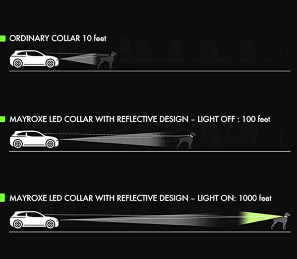 * The reflective strips of the light up dog collars design on both sides can protect dogs even the light of LED dog collar rechargeable is off, and the light up dog collars help vehicles see your dog well.