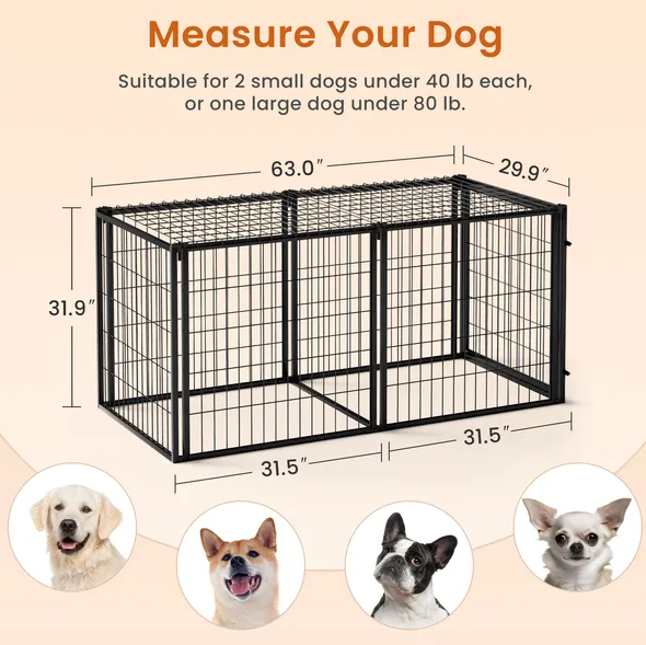 Right Size: The size of the dog crate is 63"L x 29.9"W x 31.9"H, before purchasing, please measure the height and length of your pet to ensure enough comfort. This dog crate furniture has a spacious interior for your furry friend, suitable for 2 small dogs under 50 lbs each, or a large dog under 100 lb.