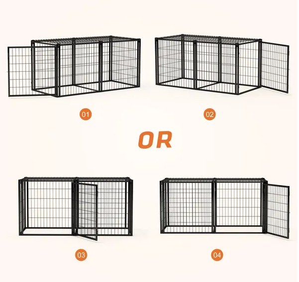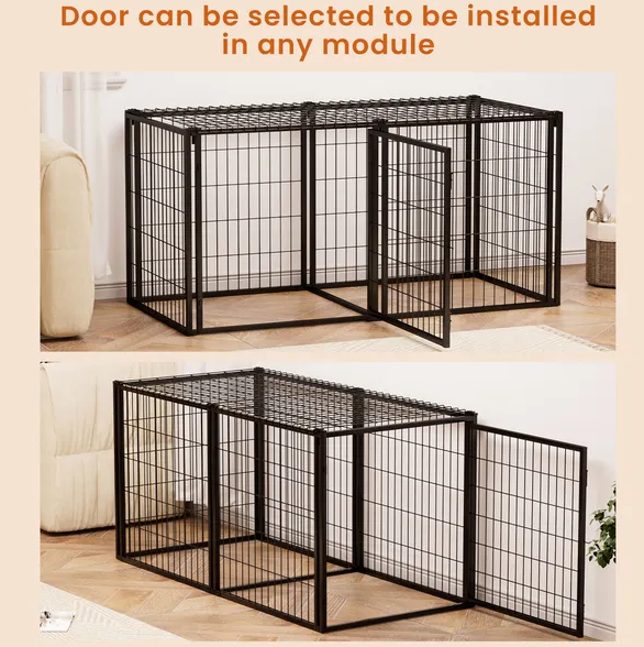 Safe top cover and flexible door placement: The dog cage has a safe top cover that can effectively prevent your pet from escaping. You can open it and play with the dog, or you can lock it directly. In addition, it provides the flexibility to install doors at any desired location, allowing you to customize access points based on the layout of your home or the specific needs of your pets.