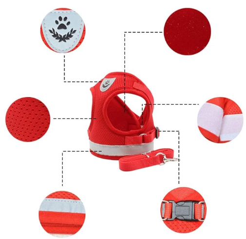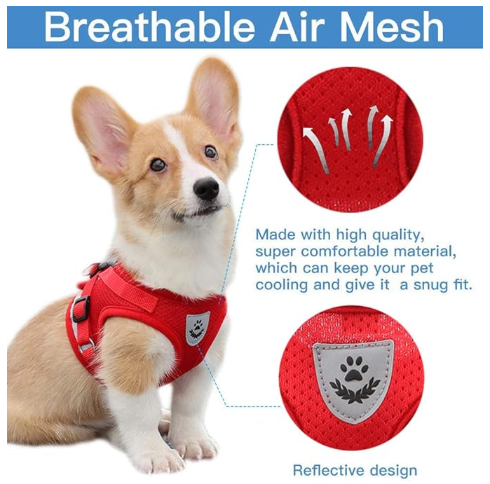 EASY TO PUT ON AND TAKE OFF: This soft mesh dog harness is easy to put on and take off with its 2 quick-release buckles. Just slide the harness over dog's head; buckle it up; adjust the straps!
