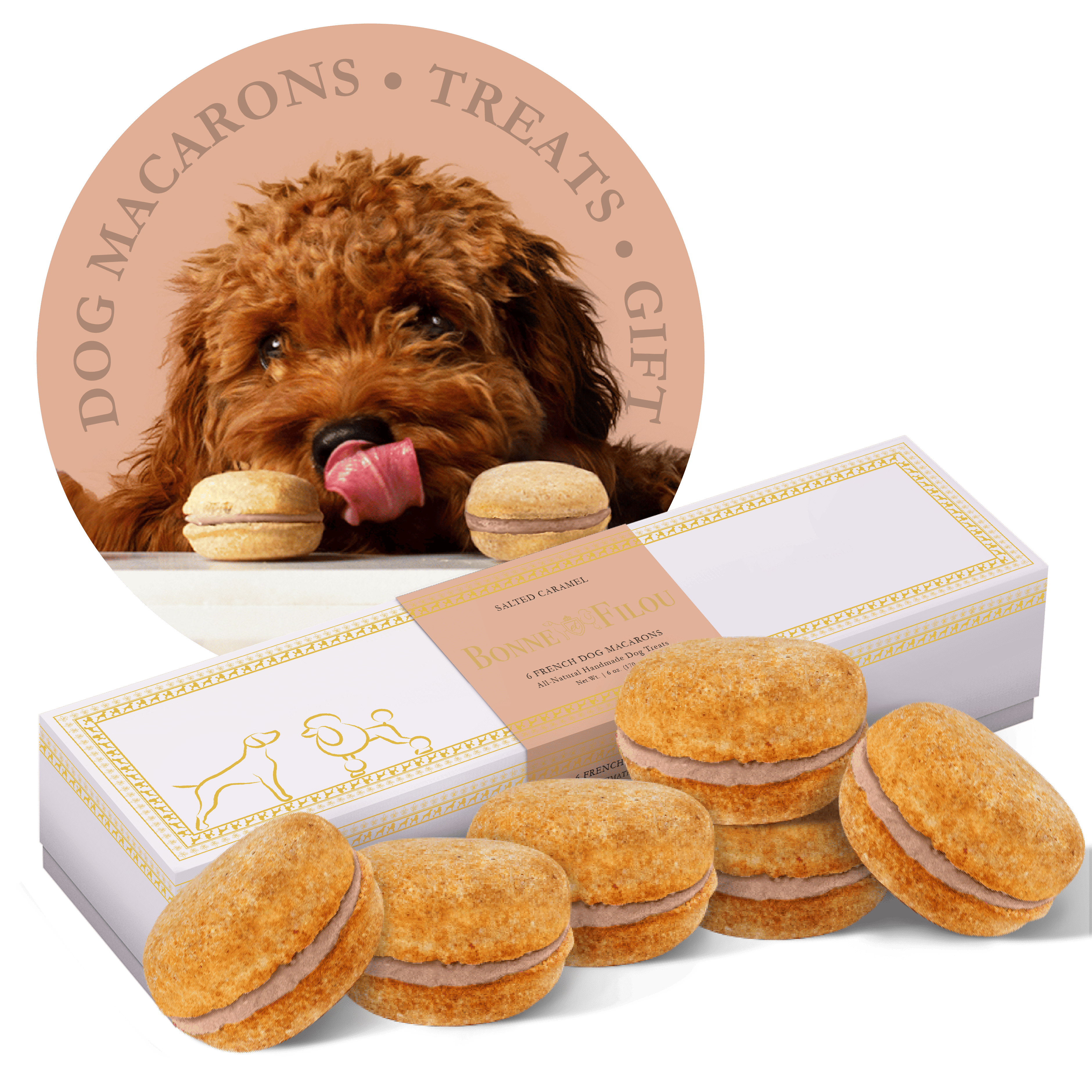 Box of 6 dog macarons - Handmade with premium human-grade ingredients in the USA- 100% natural; corn-free; wheat-free ingredients- No artificial coloring or preservatives