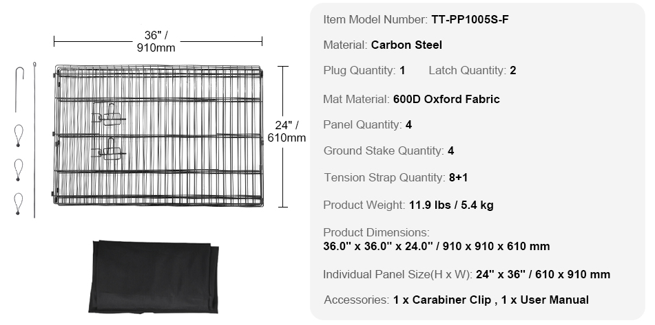 Escape Prevention: The pet playpen includes 4 long ground stakes and 1 reinforced stake to securely anchor the playpen in place. Dual door latches and 1 carabiner clip prevent pets from opening the door and escaping. Strong, tightly knit metal mesh resists play and chewing, and the Oxford fabric with elastic buckles is snugly fitted to the base for added security.