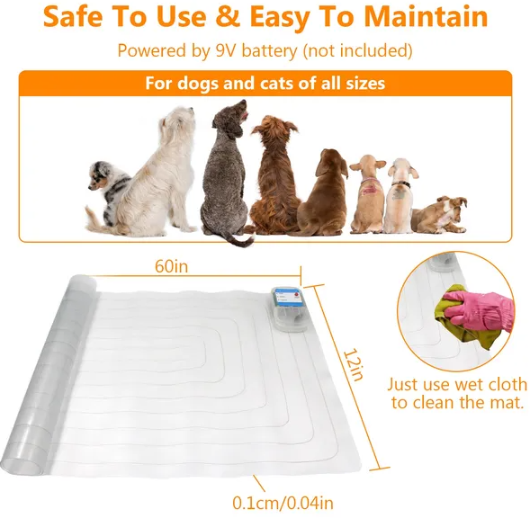 Safe To Use: Powered by 1*9V alkaline battery (not included); this shock mat only produces low-power electronic pulse like static electricity; safe yet strong enough to drive away pets. To protect your pets; the static function will shut off for 200s if your pet remains on the mat for more than 15s. Then it will restart to work until your pet leaves the mat.