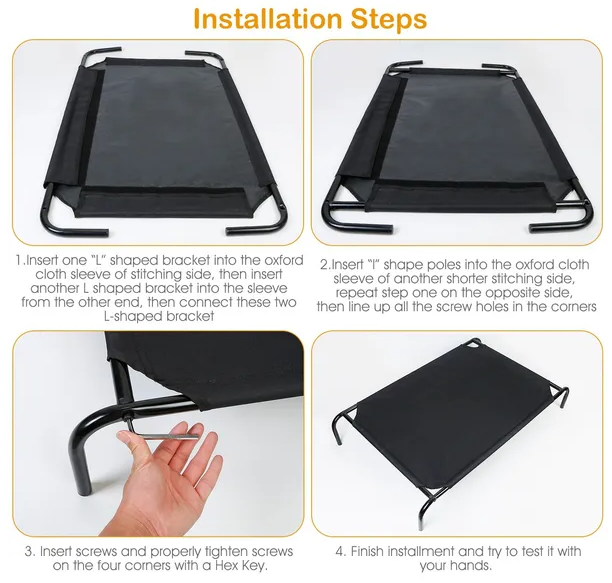 • Easy Installation: Come with 4Pcs L shaped brackets; 2Pcs I shaped brackets and oxford fabric cloth with 2 sides stitching and 2 sides fasten tape; you can finish installation quickly. Just put the coming bed brackets through the four sides of the bed mesh fabric separately; then fix them with the screws(included). Besides, it comes with user-friendly four anti-slipping feet pads for the bed brackets.