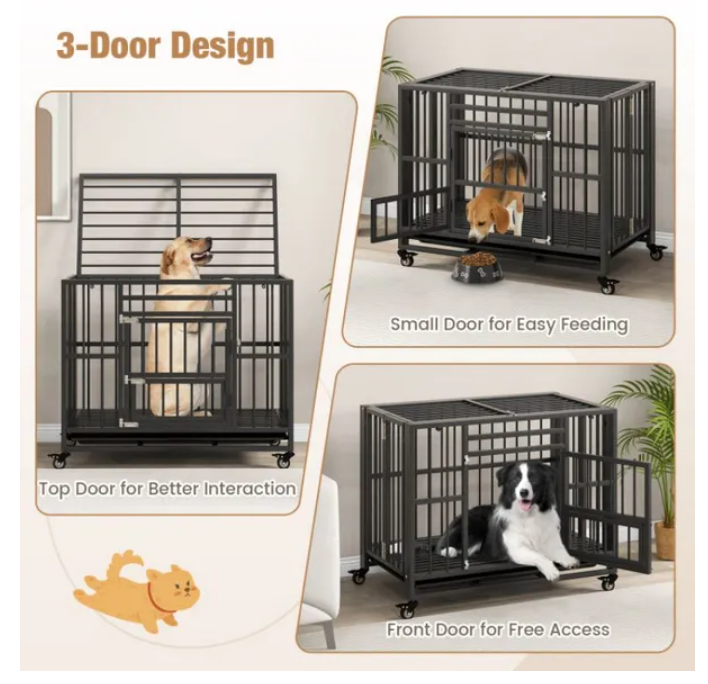 Easy Access: The metal dog kennel crate features a top door for easy interaction and a front door for seamless entry and exit. Besides, there exists a small door, making it easy to feed food and water. And all doors are secured by sturdy spring-loaded door latches, which can effectively prevent dogs from escaping.