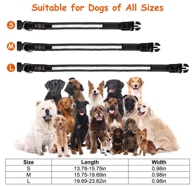 * These LED dog collar' length are adjustable, suitable for small, medium-sized and large dogs