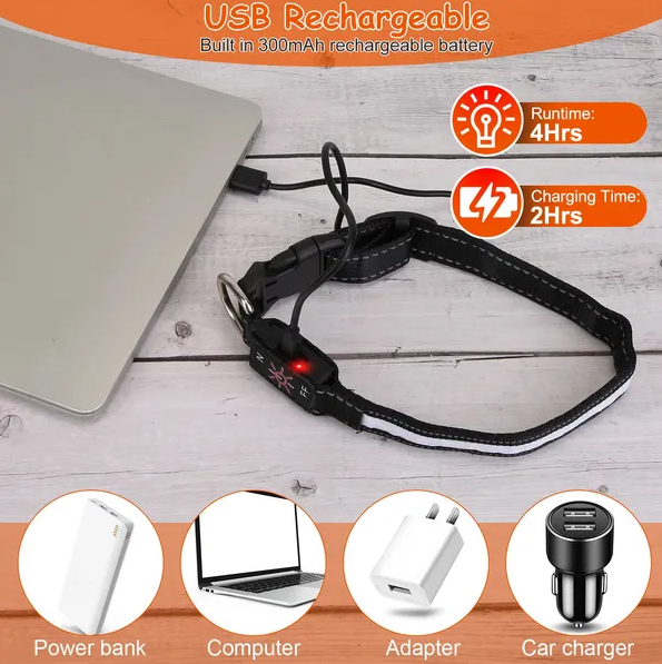 USB Rechargeable & Long-lasting: Built in 300mAh rechargeable battery, the dog collar with light is long lasting during use after 2 hours’ fast charging. The USB rechargeable feature also provides much convenience for charging.