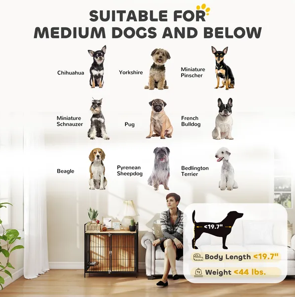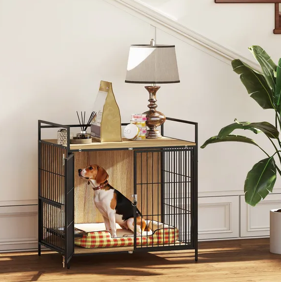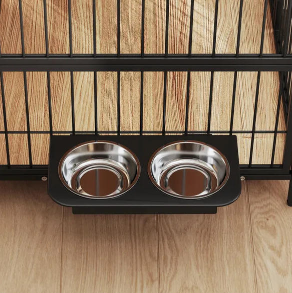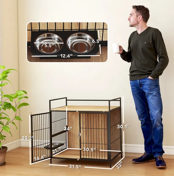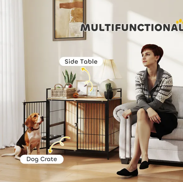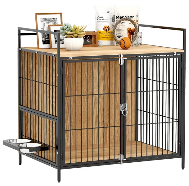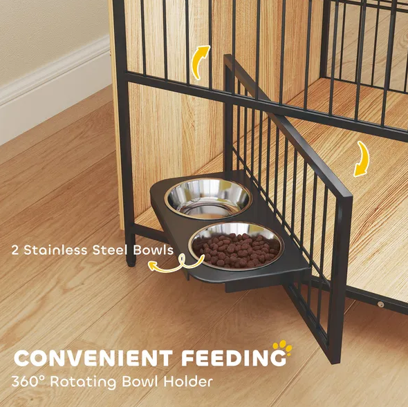 Upgrade your pet's space with the PawHut dog furniture crate that doubles as a sleek side table! Designed to blend in seamlessly with your decor, it provides a secure and comfortable space for your furry friend while offering table storage on top. The 360° rotating bowl holder with two bowls makes pet meal planning effortless, while the dual doors have a secure double-lock system to give security. Space-saving, stylish, and great for pet owners who want both function and elegance at home!