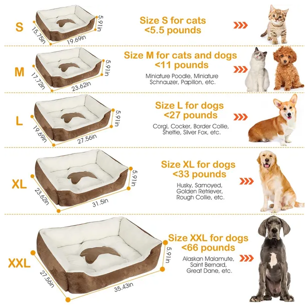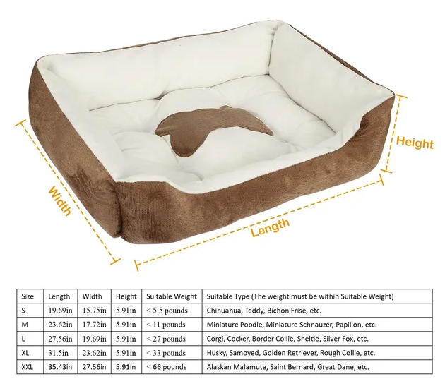 *FIVE OPTIONAL SIZES*: The S size-19.69in x 15.75in x 5.91in (L x W x H) is suitable for dogs within 5.5 pounds; the M size-23.62in x 17.72in x 5.91in (L x W x H) is suitable for dogs within 11 pounds; the L size-27.56in x 19.69in x 5.91in (L x W x H) is suitable for dogs within 27 pounds; the XL size-31.5in x 23.62in x 5.91in (L x W x H) is suitable for dogs within 33 pounds and the XXL size-35.43in x 27.56in x 5.91in (L x W x H) is suitable for dogs within 66 pounds. (Note: All the sizes (s/m/l/xl/xxl) of brown beds are a little smaller than the black bed and the difference is 1-2in)