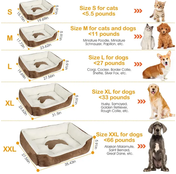 *FIVE OPTIONAL SIZES*: The S size-19.69in x 15.75in x 5.91in (L x W x H) is suitable for dogs within 5.5 pounds; the M size-23.62in x 17.72in x 5.91in (L x W x H) is suitable for dogs within 11 pounds; the L size-27.56in x 19.69in x 5.91in (L x W x H) is suitable for dogs within 27 pounds; the XL size-31.5in x 23.62in x 5.91in (L x W x H) is suitable for dogs within 33 pounds and the XXL size-35.43in x 27.56in x 5.91in (L x W x H) is suitable for dogs within 66 pounds. (Note: All the sizes (s/m/l/xl/xxl) of brown beds are a little smaller than the black bed and the difference is 1-2in)