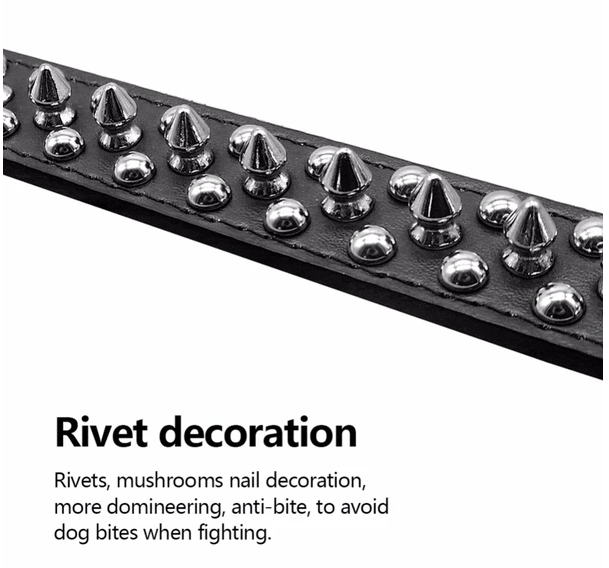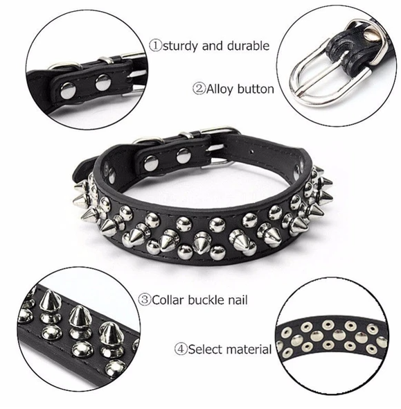 Several colors and sizes for chooseWe have 9 colors and 5 sizes for different suits; you could choose a lovely color for your boy or girl. PU leather soft and skin friendly, high-quality materials made. Spiked anti-bite collarsCool and durable zinc alloy rivets spiked collar, protect your baby dog's neck when the pets play roughly. The rivets collar is not only a cool decoration for your dog, also could prevent your dog from biting the collar. Zinc alloy buckle and heavy duty D-ringFive holes for adjustable, zinc alloy buckle and heavy-duty D-ring, easy to attach ID tag and dog leash. 1.1" wide rivets studded collar1.1" wide rivets studded collar, compared with other spiked collars, our collar is wide and has more rivets, all the rivets fixed by hand, more durable and last a long time, great for punk cool decoration and protection for your dog's neck. Spiked The spiked dog collar could protect your dog's neck when they are fighting with other pets. Anti-bite with this collar on, your dog couldn't bite around or destroy the collar because of the spikes. The spike is not so sharp, it does not hurt your dog's skin, the smooth nail head won't pull your dog's hair out. AdjustableThe collar has five sizes XXS XS S M L for choose. XS: adjustment necklace range 15-18 inch; S: adjustment necklace range 17-20 inch; M: adjustment necklace range 19-22 inch; L: adjustment necklace range 21-24 inch. Five adjustable eyelets, you can adjust the size freely. Suitable for small medium dogs (should be able to fit two fingers under the collar). Extra Wide1" collar is really wide, and it is fixed by more rivet spikes, all the spikes fixed by workers' hands, more durable and last a long time, the extra wide could provide more protect for your pets than other standard spiked collars. The collar is made of high-quality comfortable PU microfiber leather, skin friendly for your pets, strong enough to hold Extra Extra Small, Extra Small, Small, Medium, Large dogs.