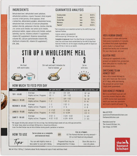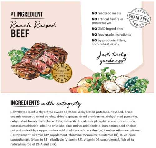 Dehydrated beef, dehydrated sweet potatoes, dehydrated potatoes, organic flaxseed, dried organic coconut, dried parsley, dried papayas, dried cranberries, dehydrated pumpkin, dehydrated honey, dehydrated kale, minerals [tricalcium phosphate, sodium chloride, potassium chloride, choline chloride, zinc amino acid chelate, iron amino acid chelate, potassium iodide, copper amino acid chelate, sodium selenite], taurine, vitamins [vitamin E supplement, vitamin B12 supplement, thiamine mononitrate (vitamin B1), D- calcium pantothenate (vitamin B5), riboflavin (vitamin B2), vitamin D3 supplement], fish oil (a natural source of DHA and EPA).